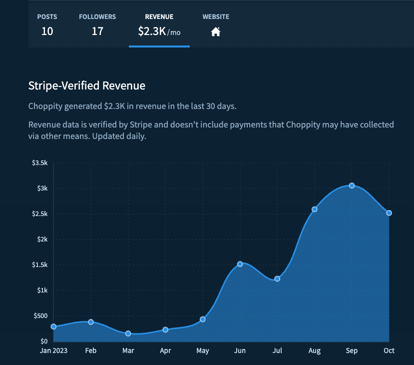 市場多大:目前每個月的收入在2.5K美金左右。Choppity的成長滿快的,不到一年的時間就從零到2.5K,滿厲害的。
