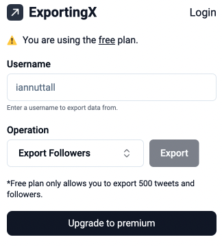 Exporting X是一個可以匯出X/Twitter資訊的網站。操作方式似乎主要是輸入使用者姓名以及選擇匯出格式,接下來就會自動匯出。