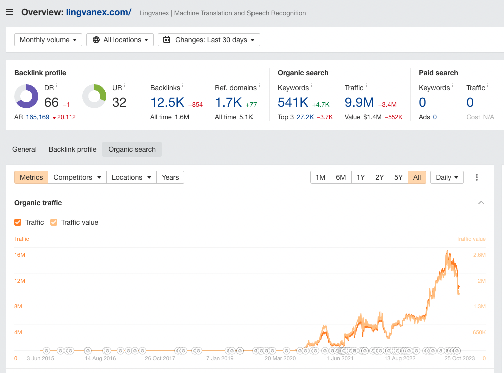 市場多大:翻譯這個市場很大,如果透過Ahrefs或similarweb來檢查的話,Lingvanex Translator每個月的流量都破百萬。在四年前他們分享每月的MRR是7.5K美金,但我猜測他們每個月的MRR可能至少是7.5萬或75萬美金。